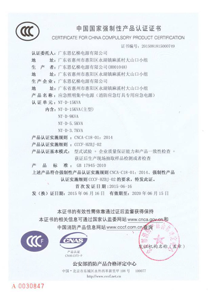 中國國家強制性產(chǎn)品認證(消防應(yīng)急燈具專用應(yīng)急電源)