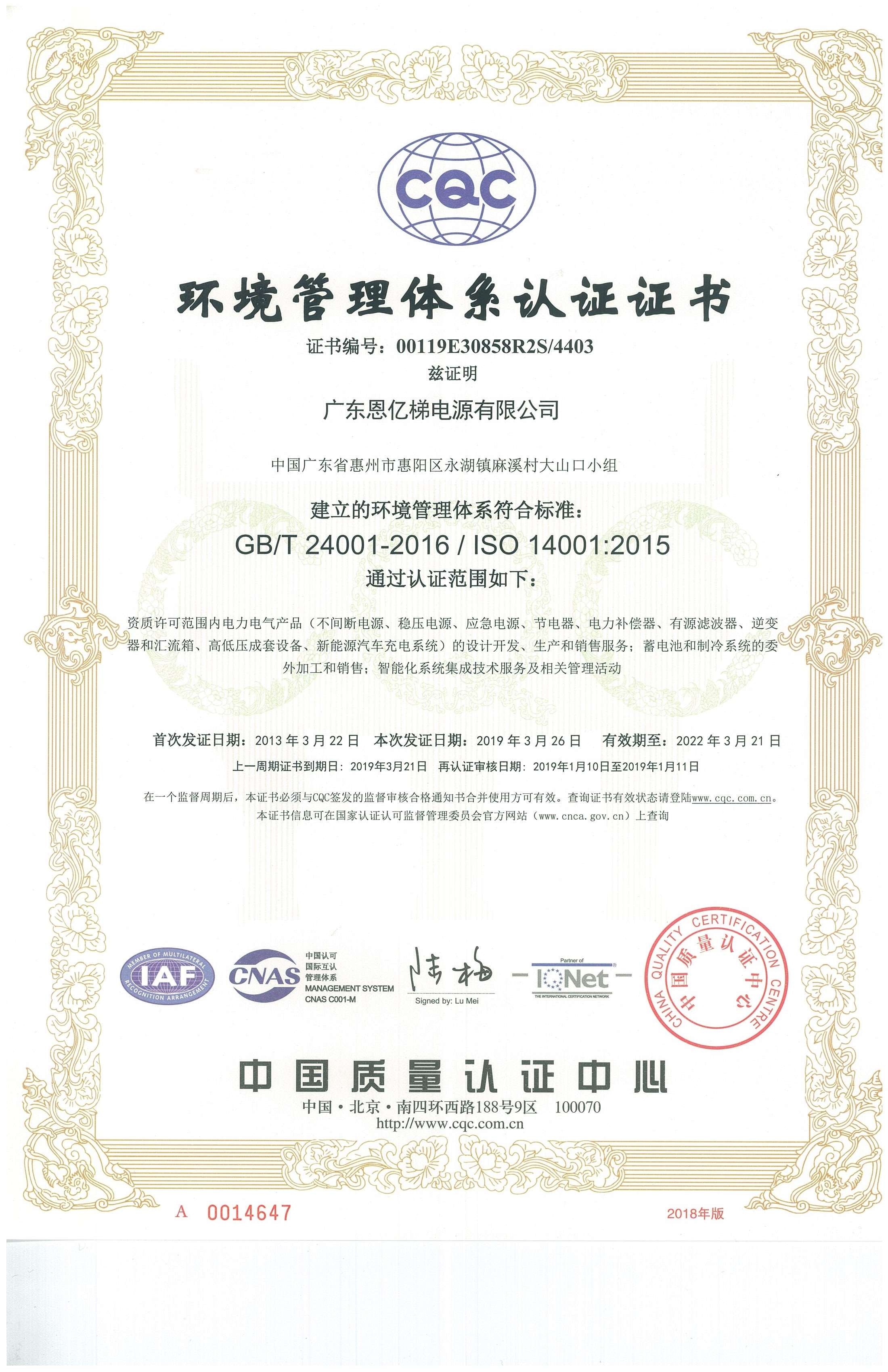 ISO14001環境管理體系認證證書