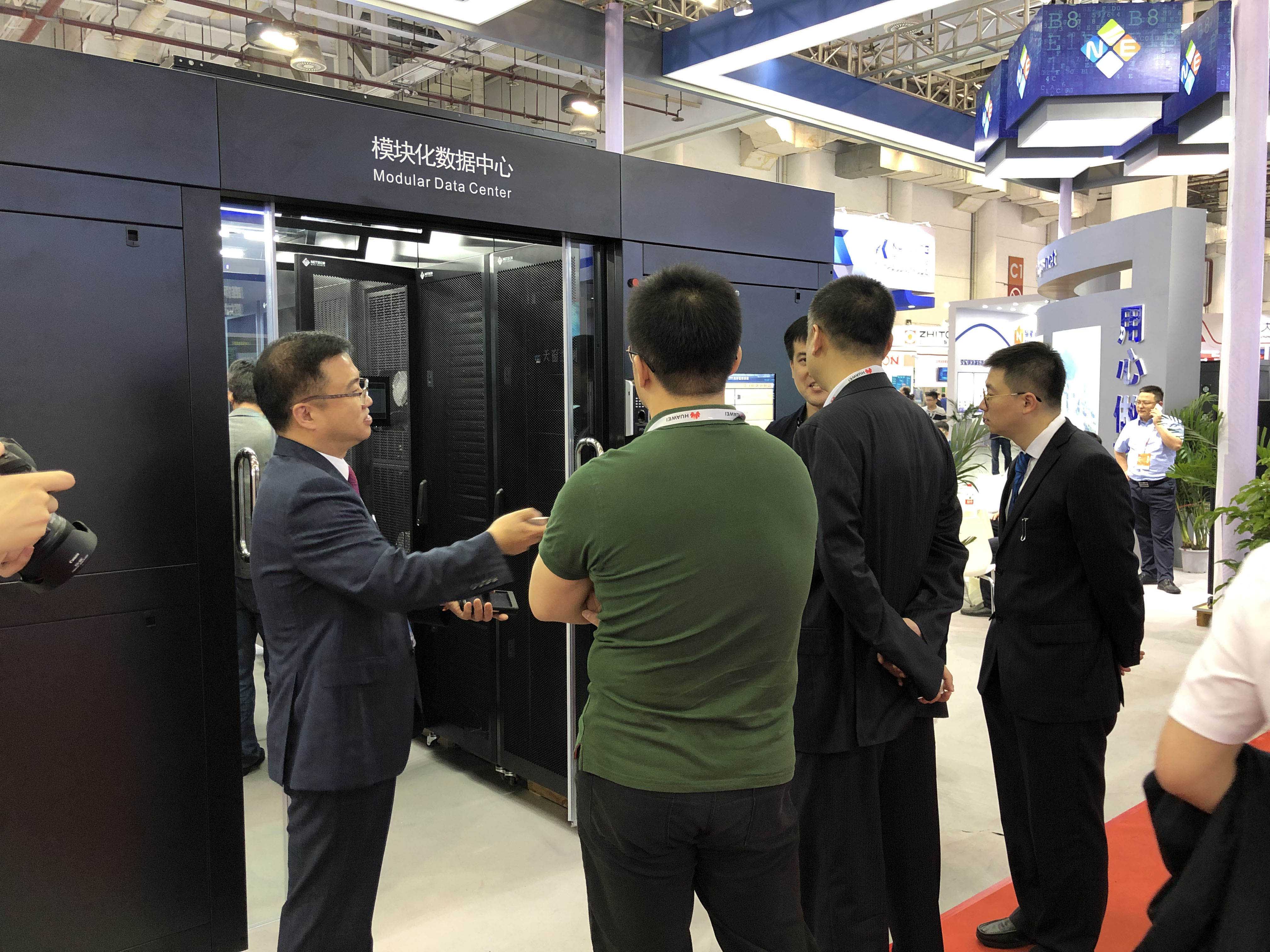工作人員向客戶介紹模塊化數(shù)據(jù)中心的應(yīng)用領(lǐng)域